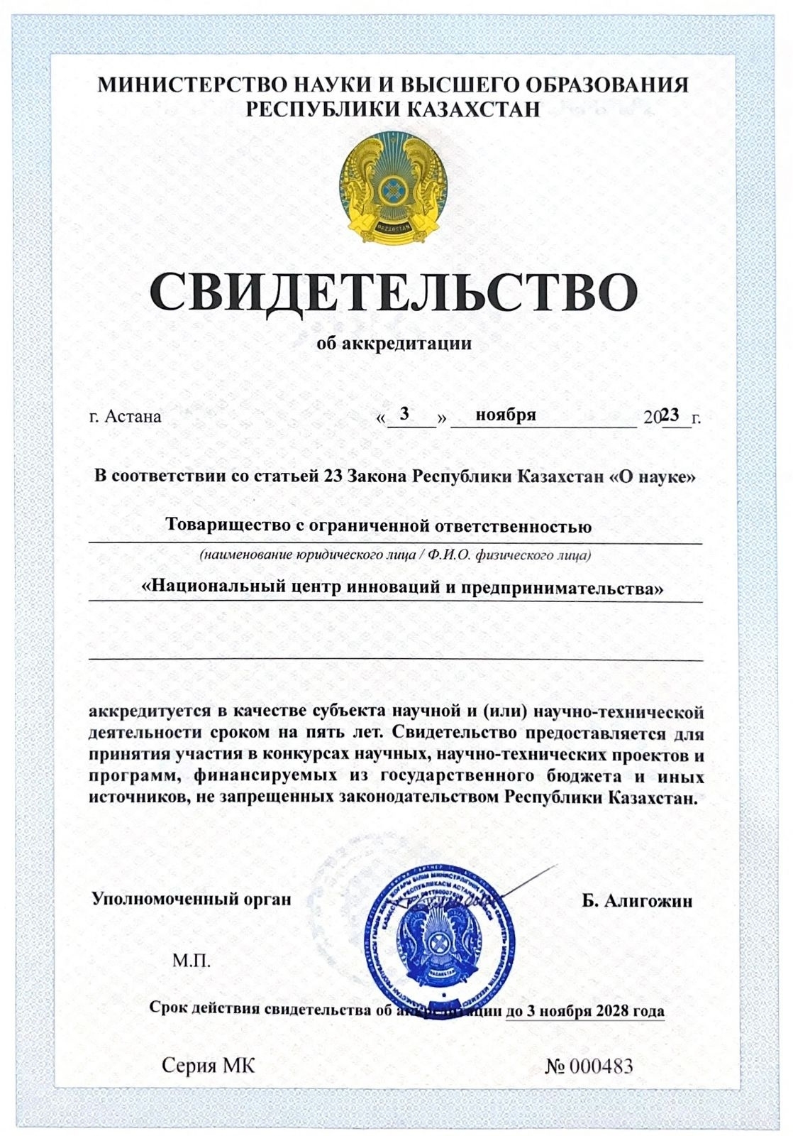 Национальный центр инноваций и предпринимательствав соответсвии со статьей 23 Закона Республики Казахстан « О науке» аккредитован в качестве субъекта научной и (или) научно-технической деятельности.